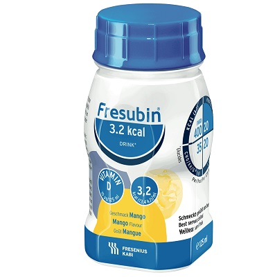 Fresubin 3.2Kcal x4 Manga é um suplemento nutricional oral completo, hipercalórico (3,2 kcal/ml)- 400 kcal, hiperproteico (20% energia) e baixo teor em fibra. Com